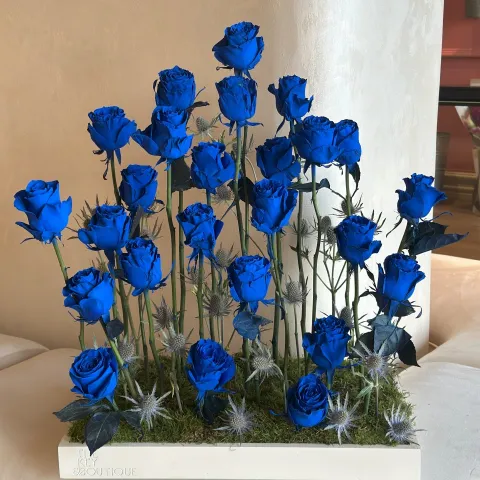 Blue roses are naturally rare and often associated with mystery, the unattainable, and new possibilities. This arrangement goes beyond conventional beauty, making it perfect for someone who appreciates the extraordinary and unique. The Azure Ascent bouquet represents luxury and sophistication that will leave a lasting impression. With ورد ازرق (blue roses) being so rare, this bouquet truly makes a statement.
